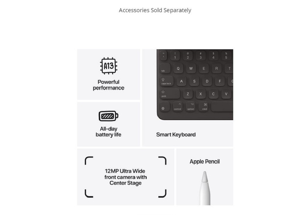 The Apple 10.2" iPad features the Retina display with a 2160 x 1620 resolution for crisp details and vivid colors, making it an ideal companion for watching movies, creating content, and much more. The Retina Display also has True Tone technology, which adjusts the display to the color temperature of the room so it's more comfortable for viewing in any light. Apple upgraded the front camera to a 12MP Ultra-Wide camera. In addition to a huge boost in image quality and a wider 122° field of view, the iPad also features Center Stage. Center Stage automatically pans the camera to keep them in view. This is especially useful when other people join in because the camera detects them and smoothly zooms out to include them. Center Stage shines during video calls and it makes them feel more natural. It works in FaceTime, but also in other third-party video-calling apps. The A13 Bionic chip is more powerful than its predecessor, the A12 Bionic chip, and supports Neural Engine machine learning. Moreover, its Smart Connector offers Smart Keyboard support for comfortable typing, while its display is compatible with the 1st gen Apple Pencil, so users can write and draw. It's equipped with Wi-Fi 5 (802.11ac), Bluetooth 4.2, a Lightning connector, and a 3.5mm audio jack. This iPad is rated for up to 10 hours of use to keep you going throughout the day.