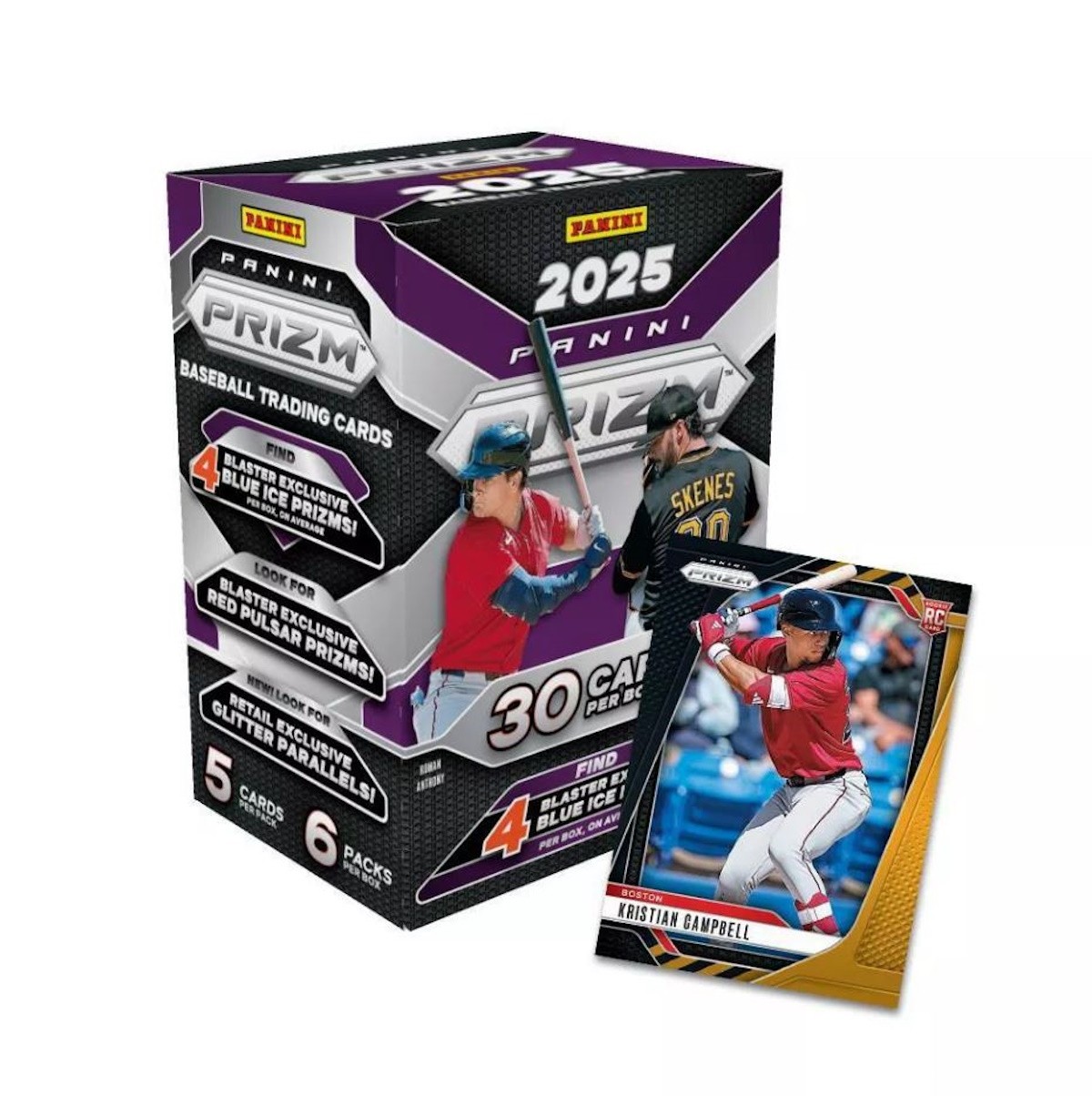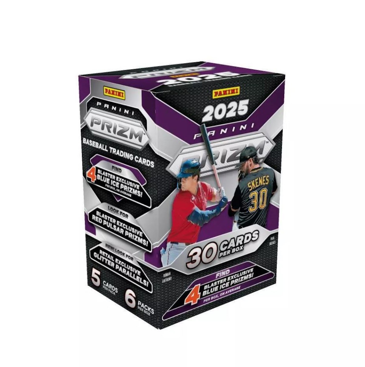 Panini presents the 2025 Prizm Baseball Trading Card Blaster Box. Each box contains 6 packs with 5 cards per pack. Look for Blaster Exclusive Blue Ice Prizms! Look for Blaster Exclusive Red Pulsar Prizms! Look for Retail Exclusive Glitter Parallels! Content may vary.
