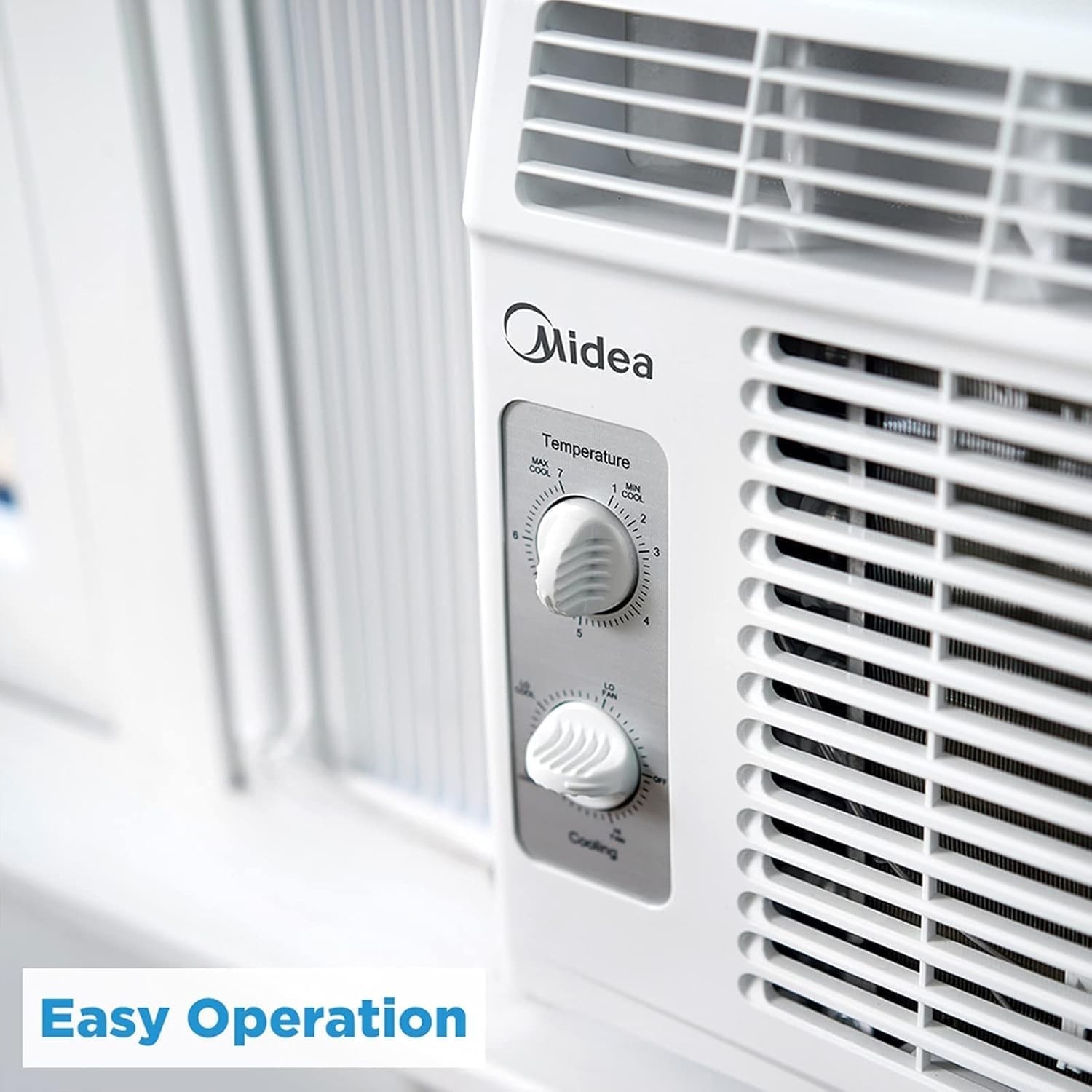 - PERFECT FOR SMALLER ROOMS - Midea's Affordable Window AC unit is perfect to help your room be as comfortable as possible. It can cool 150 sq. ft. with 7 temperature settings, 2 cooling/2 fan-only speeds, and 2-way air direction to give you the perfect amount of cooling every time.Controller type:Button Control.Air Flow efficiency:145 CFM. Moisture removal-1.27 pints/ hr.Core material : Copper..Control Type : Electronic. Refrigerant : R410A.
