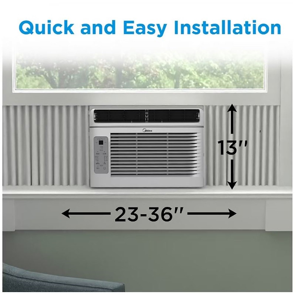 Introducing the Midea 6,000 BTU Window Air Conditioner, the perfect solution for those who want to get cooling, dehumidification, and fan modes in one compact unit. With an easy-to-use digital control panel featuring an LED display, you can easily adjust the settings to your liking. Keep your home clean and green with washable and reusable filters that ensure optimal performance. The Midea 6,000 BTU Window Air Conditioner also features intelligent features such as sleep mode and a 24-hour programmable timer. Control your airflow direction with Air Directional Louvers, allowing you to direct the airflow left or right, or up or down. Installation is a breeze with the included installation kit, fitting windows 23"-36" wide and 13" high. The clean filter indicator light lets you know when it's time for cleaning. Stay cool and comfortable all summer long with the Midea 6,000 BTU Window Air Conditioner.
