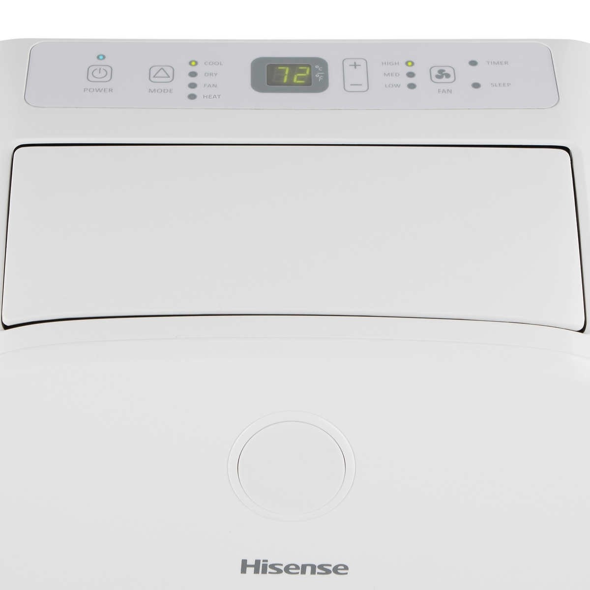 This Hisense 550 sq.ft. 3-speed portable air conditioner with LCD remote control also features a dehumidifier function. This SACC 8,000 BTU cooling and 10,000 BTU heating capacity portable air conditioner can be placed in large rooms and is easy-to-install with the included window kit for windows 18 - 50 inches wide. Additional features include a quiet compressor, and a new centrifugal fan design (provides quiet operation, 49 dB on low), programmable 24-hour on/off timer, dimmable LED digital controls, and 2-way airflow adjustment.