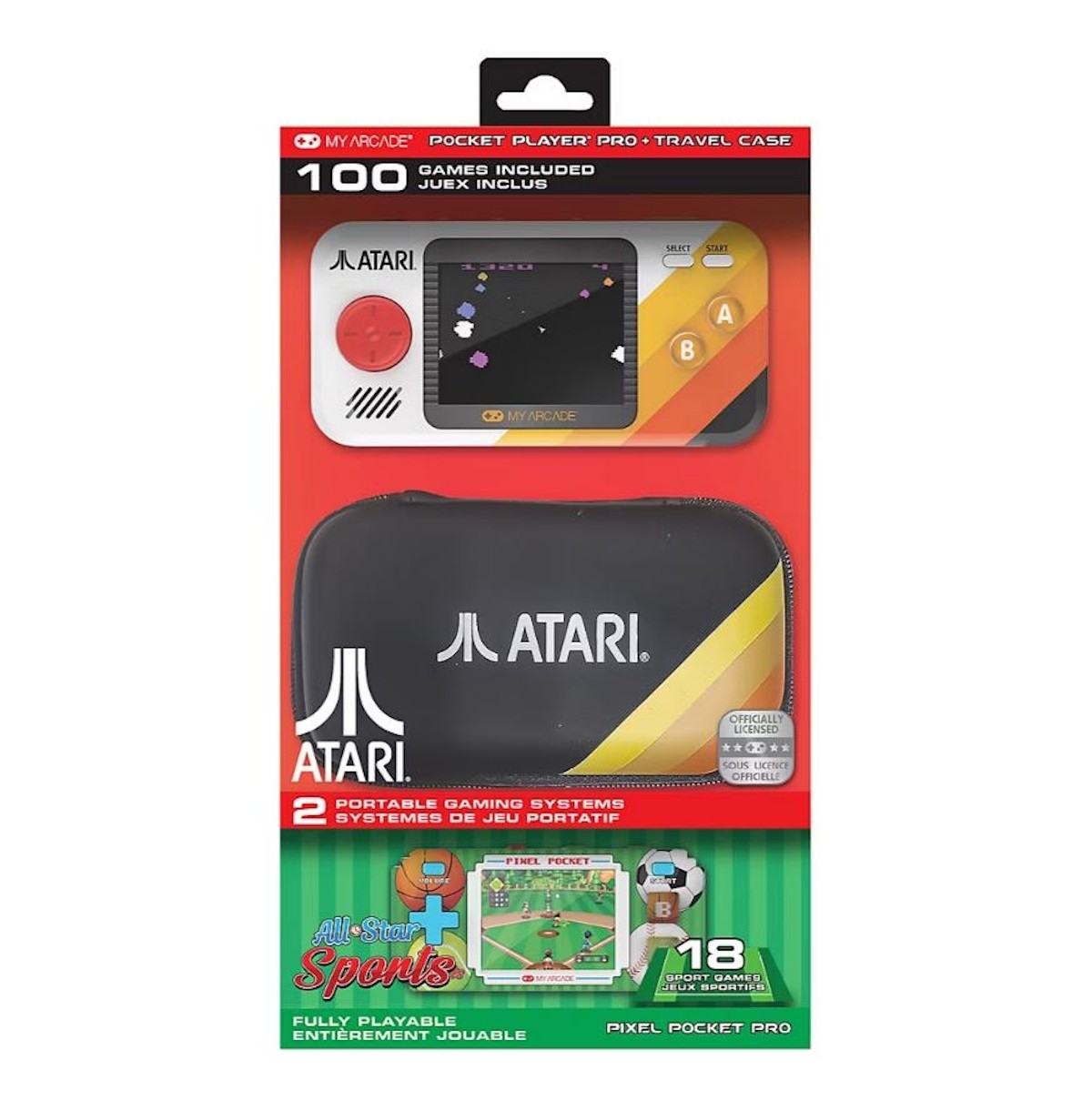 Take a trip back to the golden age of gaming with the Pocket Player Pro – Atari Edition! Packed with 100 officially licensed Atari classics and bonus games, this handheld delivers nostalgic fun on a crisp 2.75" full-color screen. Enjoy smooth, comfortable play with its ergonomic design, built-in speaker with volume control, adjustable screen brightness, and 3.5mm headphone port. Power it up with four AA batteries (not included) or the included power cable. The complete set includes a travel case, power cable, screen protector, and lanyard—plus a bonus All-Star Sports Pixel Pocket Pro, featuring 18 fast-paced sports games on a vibrant 2" screen.
