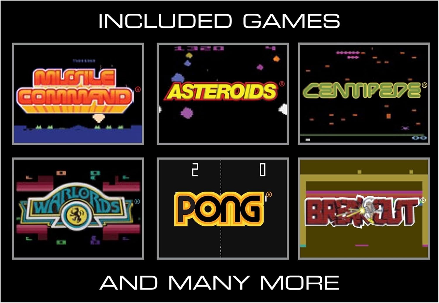 Titles include Asteroids®, Centipede®, Millipede®, Breakout®, Missile Command®, Tempest®, and many more plus bonus games