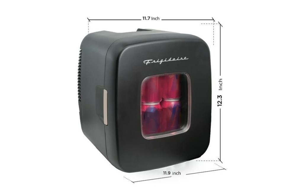 The Frigidaire 12 can mini personal beverage cooler fridge is a cool and fun way to keep your favorite beverages and snacks cold. The retro design will look great with any décor whether contemporary or traditional. It is perfect for a dorm room, office or RV. This personal refrigerator is designed to easily fit where you wish to have it, whether that be a place of business table, bookshelf or desk. With a jumbo see through window you will be able to easily see any snacks and beverages you have stored for simple selection. This has a convenient carrying handle. Store your moisturizers and beauty tools inside for a refreshing take on your daily skincare routine.Frigidaire Retro 12 Can 9 Liter Mini Beverage/Skincare Cooler Black EFMIS351-BK6COMFeatures:- Features built in interior lighting to help see what's inside.