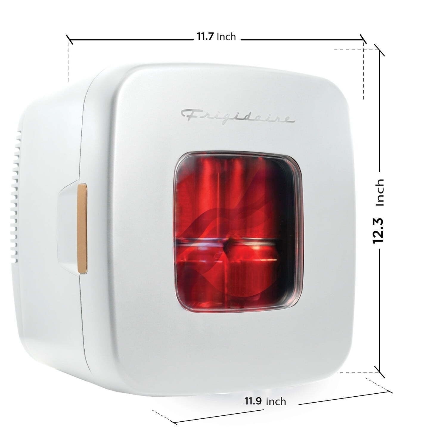 The Frigidaire 12 can mini personal beverage cooler fridge is a cool and fun way to keep your favorite beverages and snacks cold. The retro design will look great with any décor whether contemporary or traditional. It is perfect for a dorm room, office or RV. This personal refrigerator is designed to easily fit where you wish to have it, whether that be a place of business table, bookshelf or desk. With a jumbo see through window you will be able to easily see any snacks and beverages you have stored for simple selection. This has a convenient carrying handle. Store your moisturizers and beauty tools inside for a refreshing take on your daily skincare routine.Frigidaire Retro 12 Can 9-Liters Mini Fridge/Skincare Cooler White EFMIS351-WHITEFeatures:- Features built in interior lighting to help see what's inside.