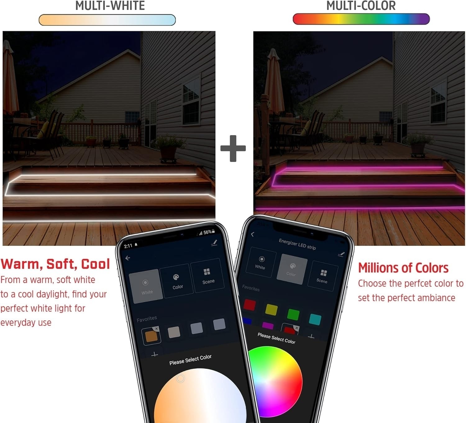 The Energizer Connect Smart LED Multi-Color and Single White Light Strip instantly set the mood with the look of professional lighting. Perfect for cozy spaces like bedrooms, offices, and living rooms, this RGBW LED light strip brings your world to life with color. To begin the simple process of setting up your device you must first download the free Energizer Connect app from the Apple Store or Google Play Store. This product comes equipped with built-in adhesive tape so that you can mount it to any flat, clean surface. Next, all you need to do is power your device and pair it with your 2.4 GHz home Wi-Fi network. Once connected, you now can control your colors, brightness, and scenes through the Energizer Connect app. The device is also voice control compatible with Alexa and Google Virtual Assistant.