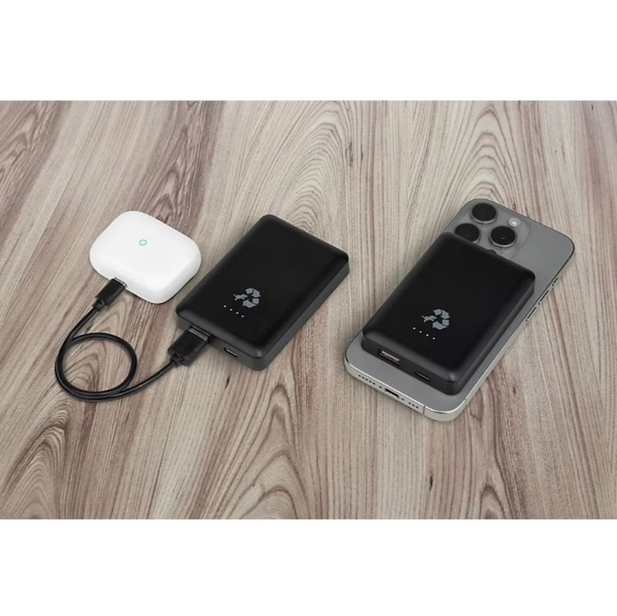 Magnetic wireless charging for your iPhone with a 5,000mAh Battery. Delivers up to 15W wireless charging speeds on contact and features a 20W Fast Charge Type-C Port (Input/Output) for recharging or powering non-wireless devices. 100% Ppost consumer recycled plastic, with 4 LED indicator lights. Plastic-free packaging, carbon neutral, and free e-waste recycling.