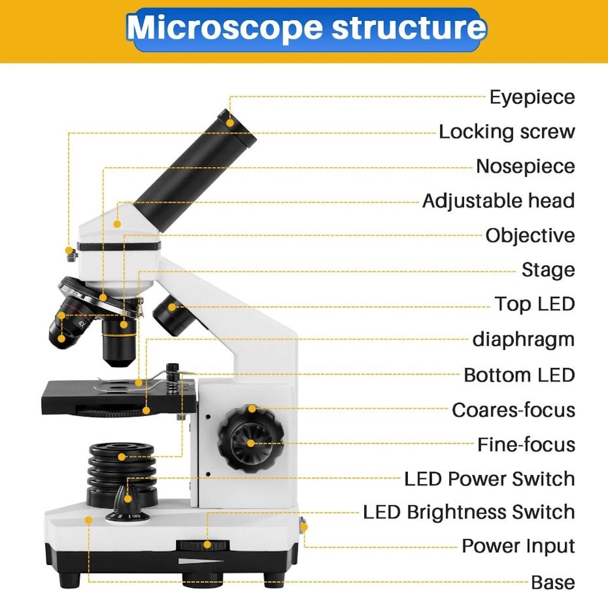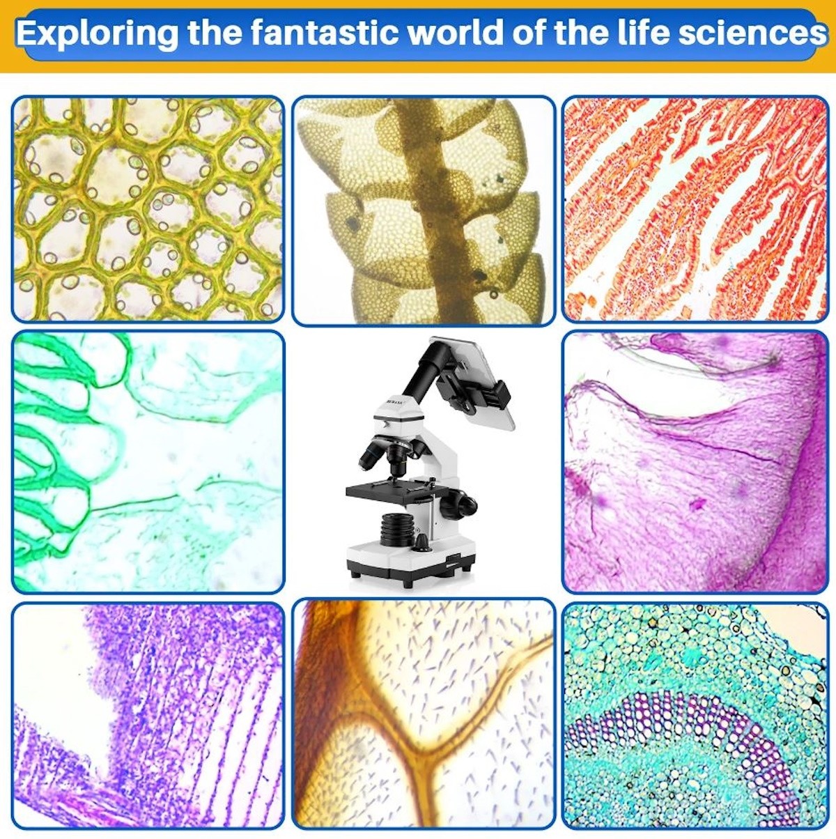 - [Complete Accessories] It comes with phone adapter, wire shutter, 10 operating accessories, 15pcs microscope slides set, carrying bag. Meet all your biological observation need. Perfect for science fair, middle and high school students.