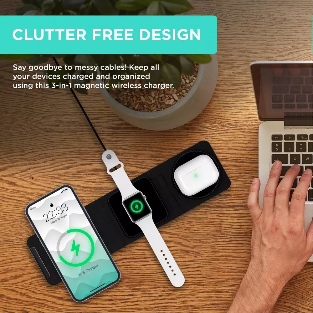 - Charges up to three devices at once: iPhone, airpods and Apple Watch