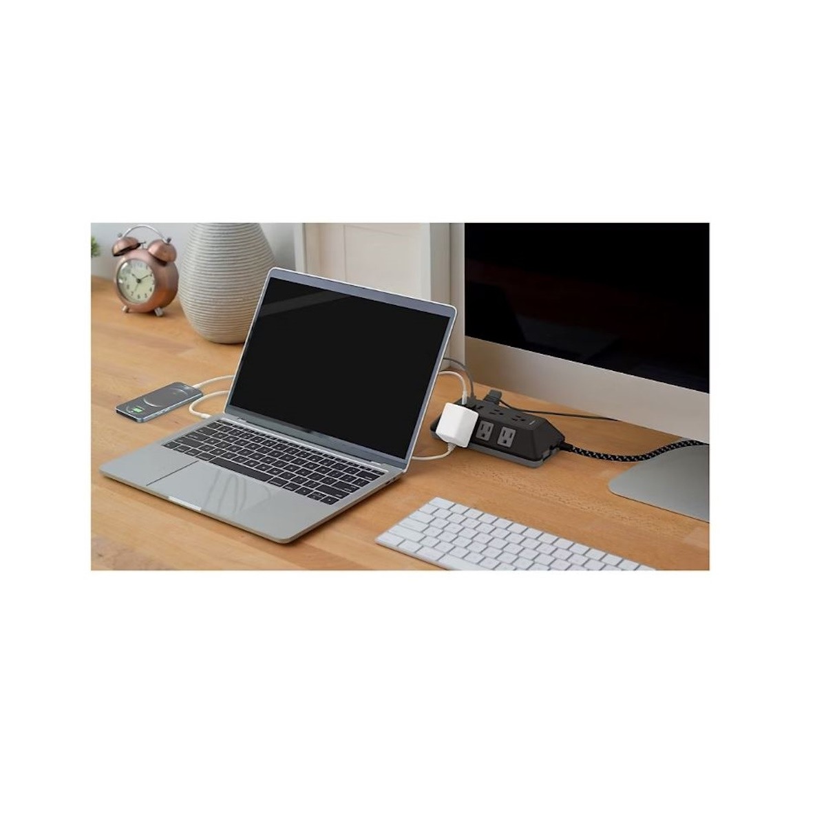 - Surge protector features adapter-spaced outlets, two USB-A ports and one USB-C port (20W)