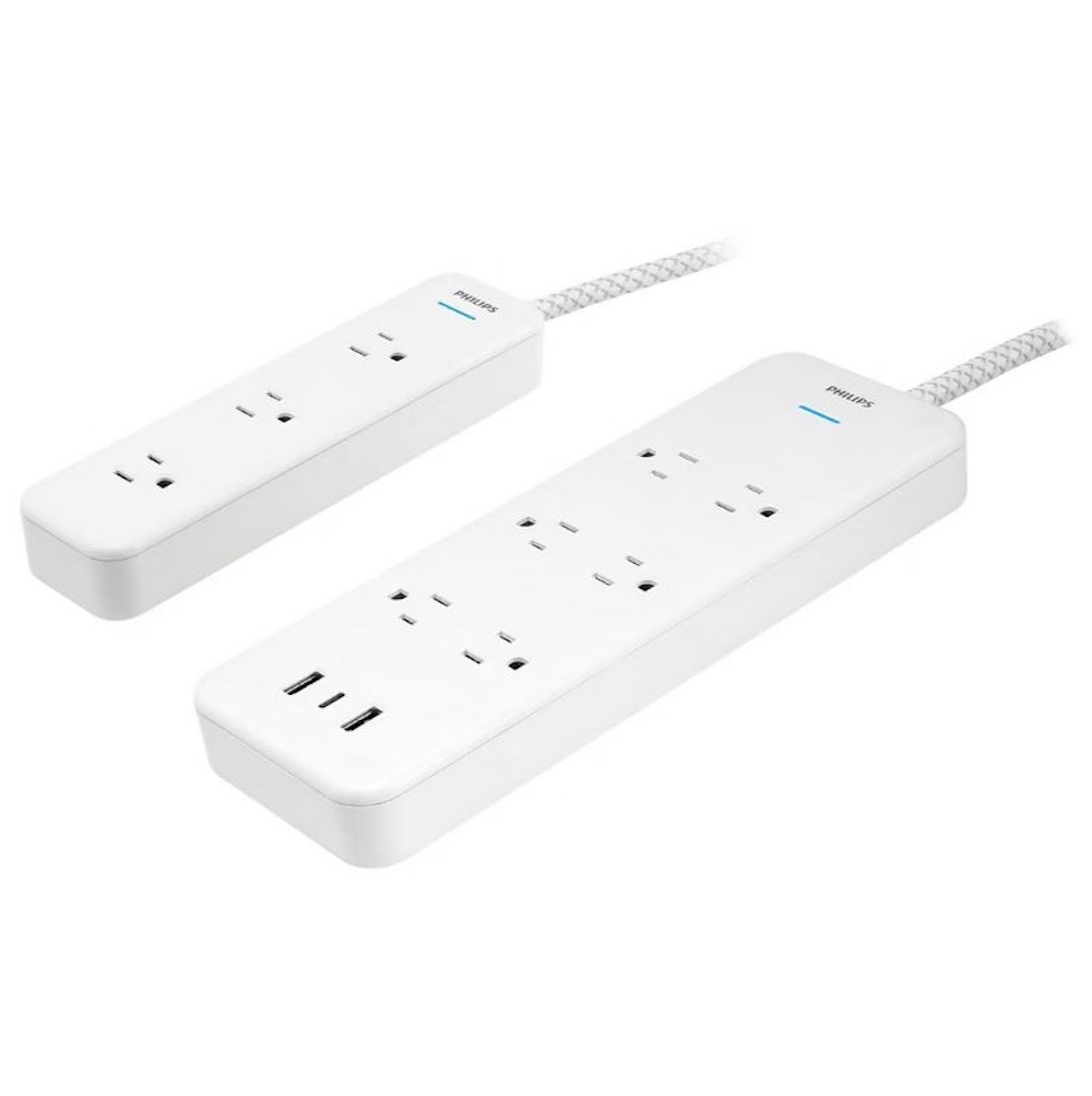 Philips 6-Outlet Surge Protector, 2 USB-A, 1 USB-C, 6' and 3-Outlet Power Strip, 6' White, 2 pk. SPP3423W/37-T1-DI1