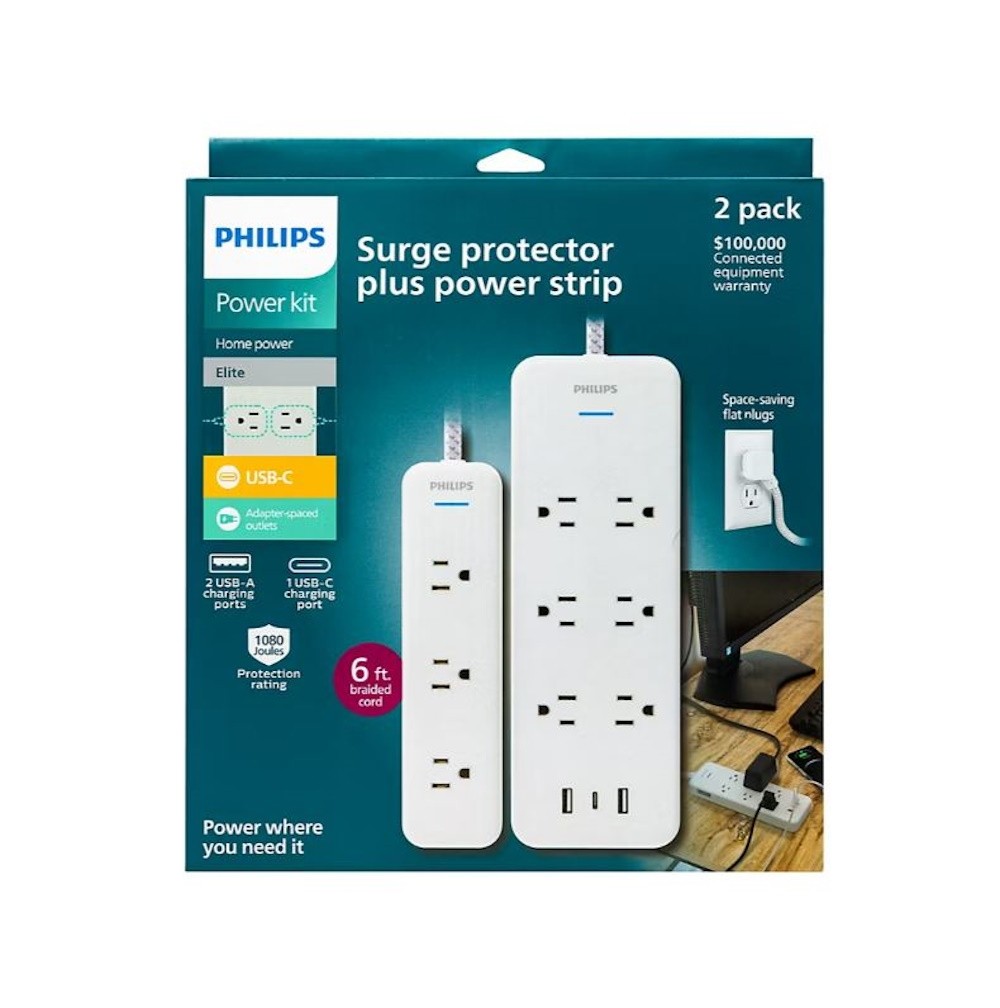 Protect and power more with this Philips Surge Protector Plus Power Strip. Ideal for streamlining your electronics, the surge protector features six adapter-spaced outlets, two USB-A ports, and one USB-C port. The sleek design provides ample room to accommodate bulky plugs and adapters into each outlet. Rated for 1080 Joules, the integrated circuit breaker protects against overloads while an LED indicates when protection is being provided. The surge protector is backed by a $100,000 connected equipment policy and a limited-lifetime replacement plan, following the highest standards of industry safety. Is your setup just a few outlets short? The power strip features three grounded outlets and provides the versatile power source you need for household appliances, lamps, tools, seasonal lighting, and electronics. Both items in this power pack feature flexible 6' braided cords. Plus, their low-profile flat plugs are perfect for inserting into outlets behind furniture, seamlessly blending into the room without disrupting your décor with cord clutter. With this Philips Surge Protector Plus Power Strip combo pack, powering electronics has never been easier.