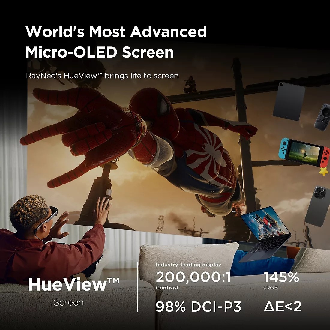 RayNeo Air 3s XR Glasses are portable huge screens for entertainment everywhere, every time! You can enjoy a mega *201" 120Hz Full HD Display on the go. Drag the screen of smartphones, or gaming consoles to glasses in front of your eyes. For iPhone 15/16 users, RayNeo's XR glasses have the magic to transform your 3D photos and videos into spatial ones, leading you to your cherished moments all over again. Main Use Cases: Home Cinema | Immersive Gaming | Private Viewing. Equivalent to a 201" screen seen at 6m away. Plug and Play, Wide Compatibility. Connect to any device with USB-C DisplayPort output, including iPhone 15/16 series, iPad Air 4/Pro 3 and newer, Samsung S20/Z Fold3/W23 and newer select Android smartphones, Switch 2, Steam Deck, and ROG Ally. Compatible devices are required to support USB-C DisplayPort output. Effortlessly connects to any HDMI-enabled device, including Xbox, PS4/5, and iPhones (up to iPhone 14, Apple's official Lightning Digital Audio Video Converter is not included). Quantum Leap in Image Quality. RayNeo's latest HueView empowers vision with 98% DCI-P3, E<2 color accuracy, 200,000:1 infinite contrast, and 145% sRGB vibrant colors. Enjoy incredible detail on a 201" mega screen while watching the movies, TV shows, and games you love. Rest-Assured OptiCare. Eye comfort is enhanced with RayNeo's exclusive OptiCare, which intelligently utilizes 3840 Hz DC dimming and PWM dimming to eliminate flickering and unstable color displays under varying brightness conditions. The TUV SUD certification guarantees low blue light emission, flicker-free operation, and comfort for long-term use.