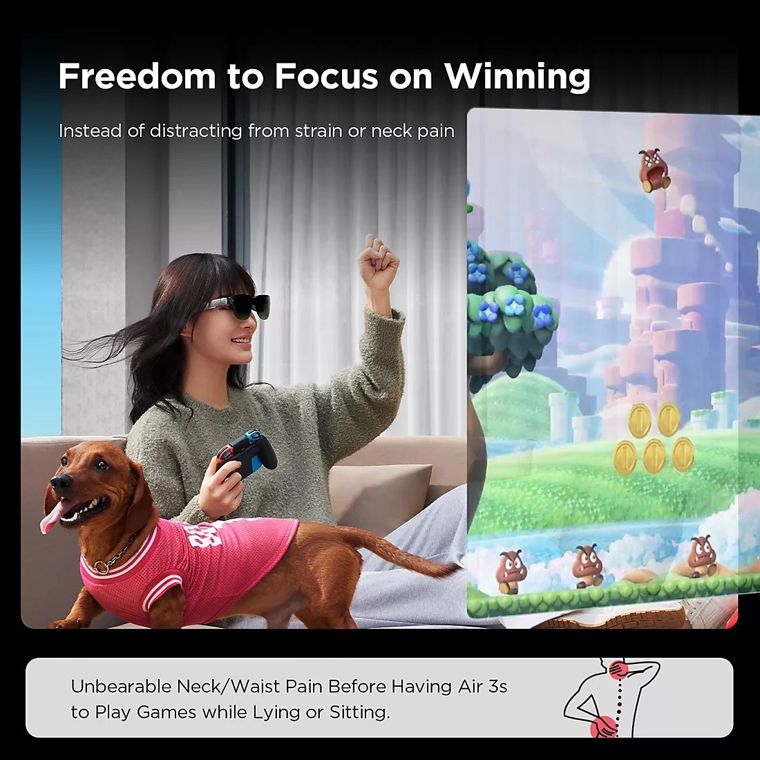 RayNeo Air 3s XR Glasses are portable huge screens for entertainment everywhere, every time! You can enjoy a mega *201" 120Hz Full HD Display on the go. Drag the screen of smartphones, or gaming consoles to glasses in front of your eyes. For iPhone 15/16 users, RayNeo's XR glasses have the magic to transform your 3D photos and videos into spatial ones, leading you to your cherished moments all over again. Main Use Cases: Home Cinema | Immersive Gaming | Private Viewing. Equivalent to a 201" screen seen at 6m away. Plug and Play, Wide Compatibility. Connect to any device with USB-C DisplayPort output, including iPhone 15/16 series, iPad Air 4/Pro 3 and newer, Samsung S20/Z Fold3/W23 and newer select Android smartphones, Switch 2, Steam Deck, and ROG Ally. Compatible devices are required to support USB-C DisplayPort output. Effortlessly connects to any HDMI-enabled device, including Xbox, PS4/5, and iPhones (up to iPhone 14, Apple's official Lightning Digital Audio Video Converter is not included). Quantum Leap in Image Quality. RayNeo's latest HueView empowers vision with 98% DCI-P3, E<2 color accuracy, 200,000:1 infinite contrast, and 145% sRGB vibrant colors. Enjoy incredible detail on a 201" mega screen while watching the movies, TV shows, and games you love. Rest-Assured OptiCare. Eye comfort is enhanced with RayNeo's exclusive OptiCare, which intelligently utilizes 3840 Hz DC dimming and PWM dimming to eliminate flickering and unstable color displays under varying brightness conditions. The TUV SUD certification guarantees low blue light emission, flicker-free operation, and comfort for long-term use.