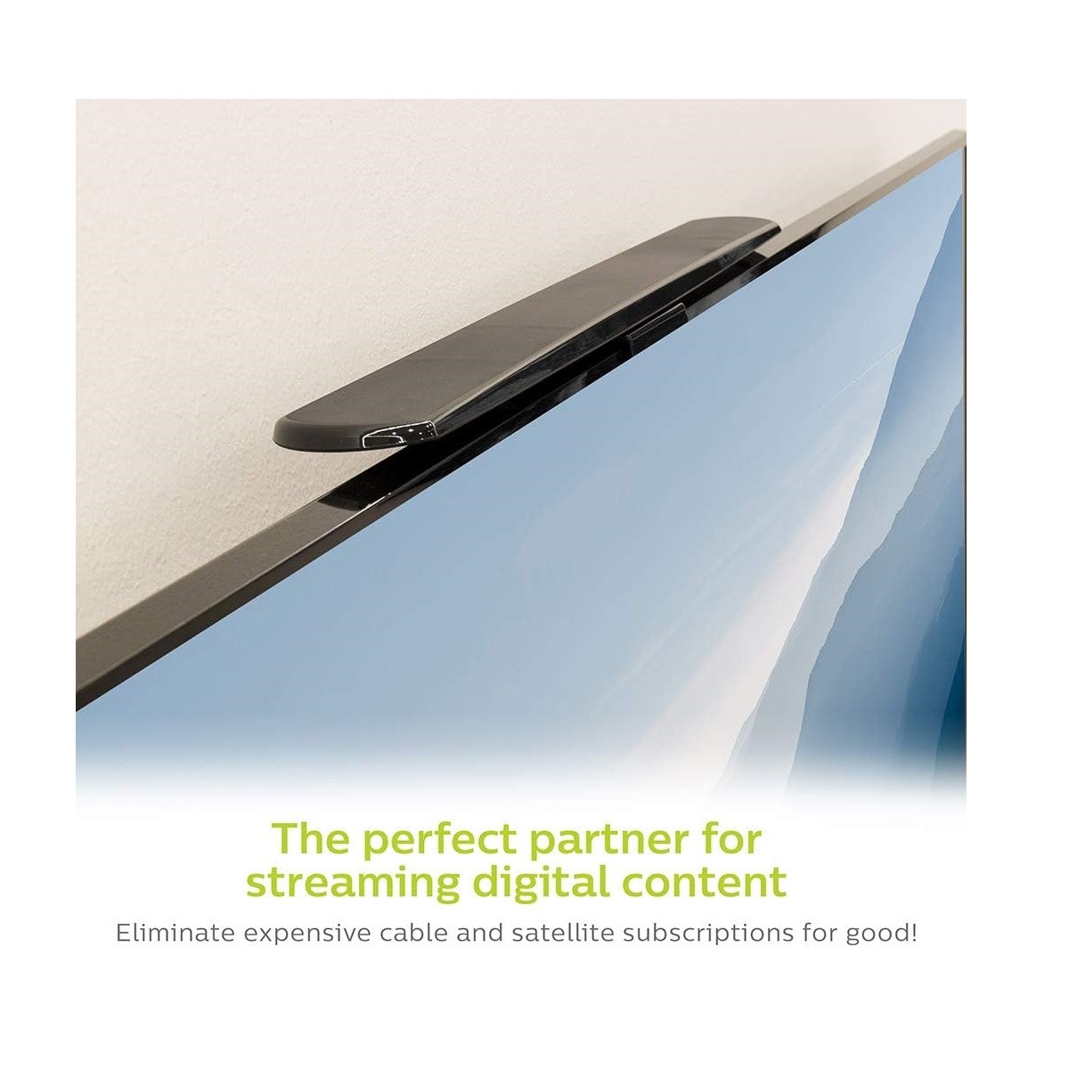 Take TV viewing to new heights with the Philips Hover HD TV Amplified Antenna. Ditch expensive cable and continue viewing your favorite local shows in full 1080p high definition at no cost. Enhanced reception and a perfect signal make this 4K/8K Ultra HD-ready indoor TV antenna the ideal counterpart to streaming your favorite digital content. Engineered for exceptional performance, this digital antenna for TV lets you experience a wide range of HDTV, VHF and UHF channels up to 50 miles from the broadcast source. The integrated amplifier with TruAmp Technology boosts the signal and blocks cell phone interference with its built-in 4G/5G LTE filter to provide clear, pure reception. This slim TV antenna fits most HDTVs and blends seamlessly into any home theater setup. Use the included bracket to sit the antenna securely atop your flat-screen TV or mount it to a wall. You can also remove the mounting bracket to lay it on a flat surface. HDTV antennas are a reliable complement to your cable or satellite subscription. When severe weather strikes, stay informed with a backup antenna for important local broadcasts. Maximize your HD viewing experience and enjoy free TV with the Philips Hover HD TV Amplified Antenna.