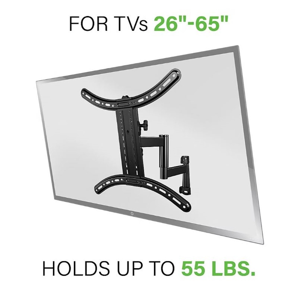 Maximum Weight (lbs.) 55 Minimum TV Size 26" Maximum TV Size 65" Item Length (in.) 17.85 Item Width (in.) 19.3 Item Height (in.) 1.99 Item Weight (lbs.) 8.2 Product Type Full-Motion TV Mounts Color Black TV Size Compatibility 55"-90"+ Mount Type Full-Motion Mount Location Wall Indoor/Outdoor Indoor Assembly Required Yes Tools Included No Hardware Included Yes Adjustable Height No Includes TV Mount, Installation Manual, Wall Template, Mount Installation Hardware Item Dimensions 19.30 x 17.85 x 1.99 Inches Item Weight 8.2 lbs. - Reviews