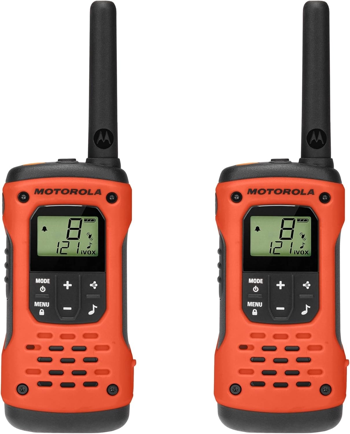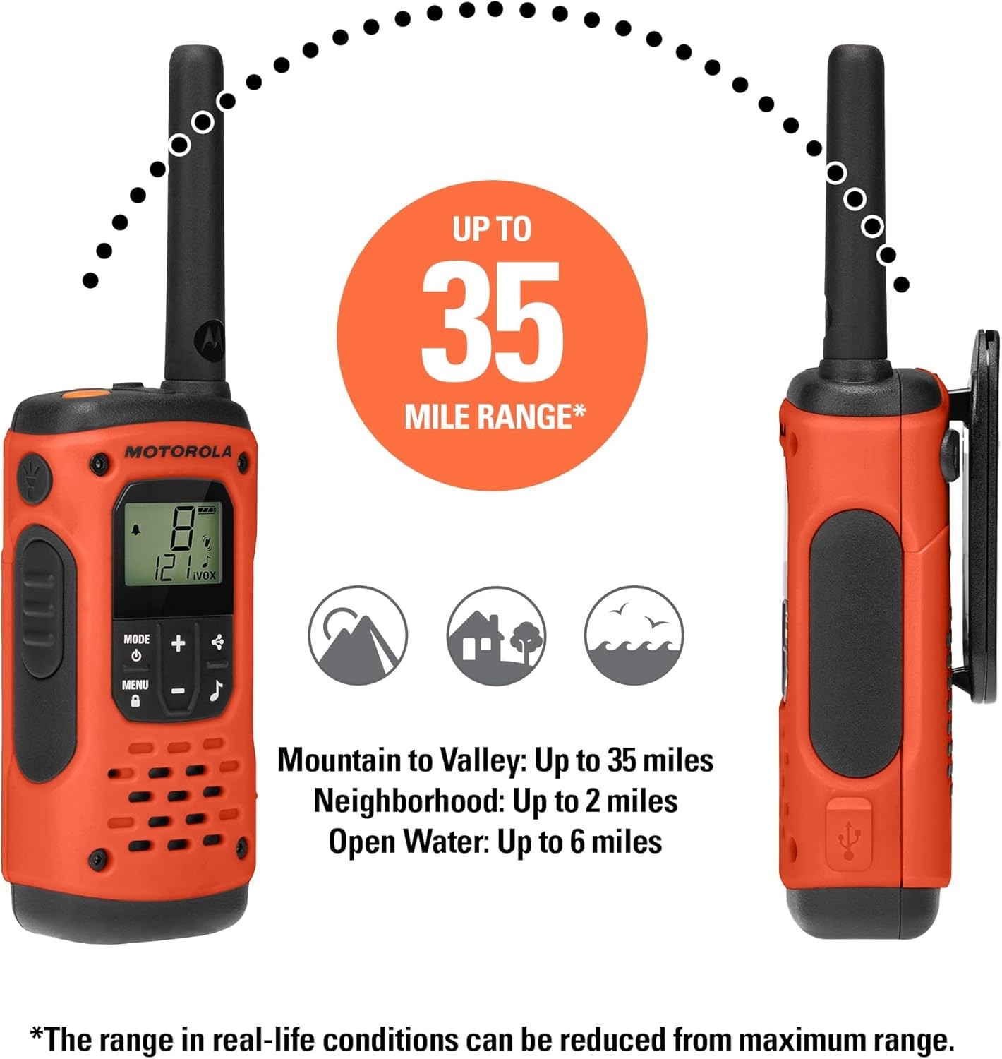 With a rugged, fully waterproof design, emergency features and a 35-mile range, the TALKABOUT T605 H₂O walkie-talkie keeps you connected and protected during outdoor adventures and more. The T605 H₂O walkie-talkie is packed with valuable radio features, like its floating capabilities and flashlight. And the T605's flashlight activates upon impact with water, so you don't have to worry about losing your device.