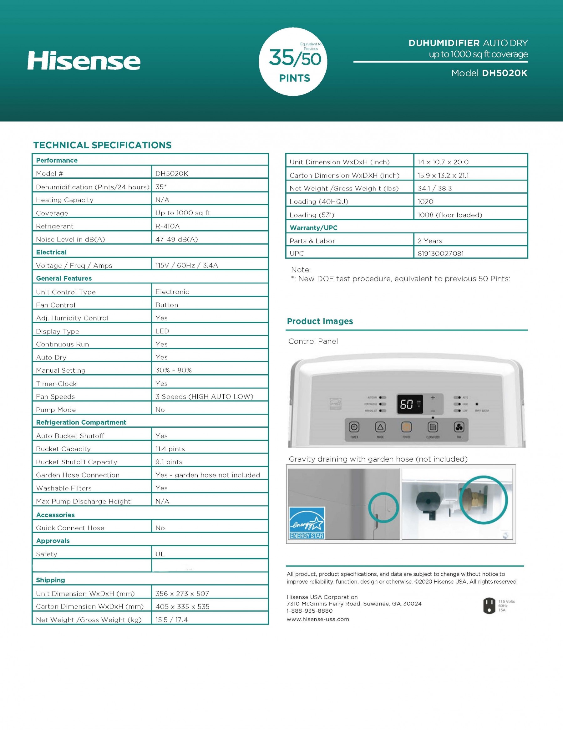 The Hisense DH5020K 35-Pint 3-Speed Dehumidifier can remove moisture from spaces up to 3,000 square feet. It quietly collects water into the slide out internal bucket or can discharge the water by connecting a garden hose through the side of the cabinet. Reliable and eco-friendly, this dehumidifier can operate at temperatures as low as 38°F and in 3 modes (manual, continuous and auto-dry). The low sound level, programmable 24-hour on/off timer, adjustable humidistat, and full-tank alert/shutoff makes this a practical solution to keep your home healthy and dry.