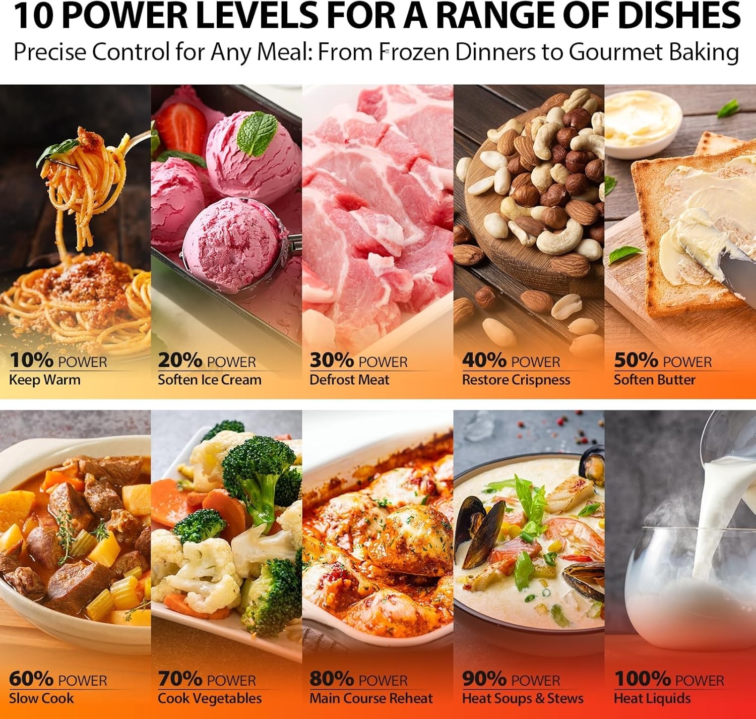 - High Power: 1250 watts with 10 power settings, clock and kitchen timer, bright digital display, easy-to-read control panel, LED cavity light and 13.6 inch glass turntable