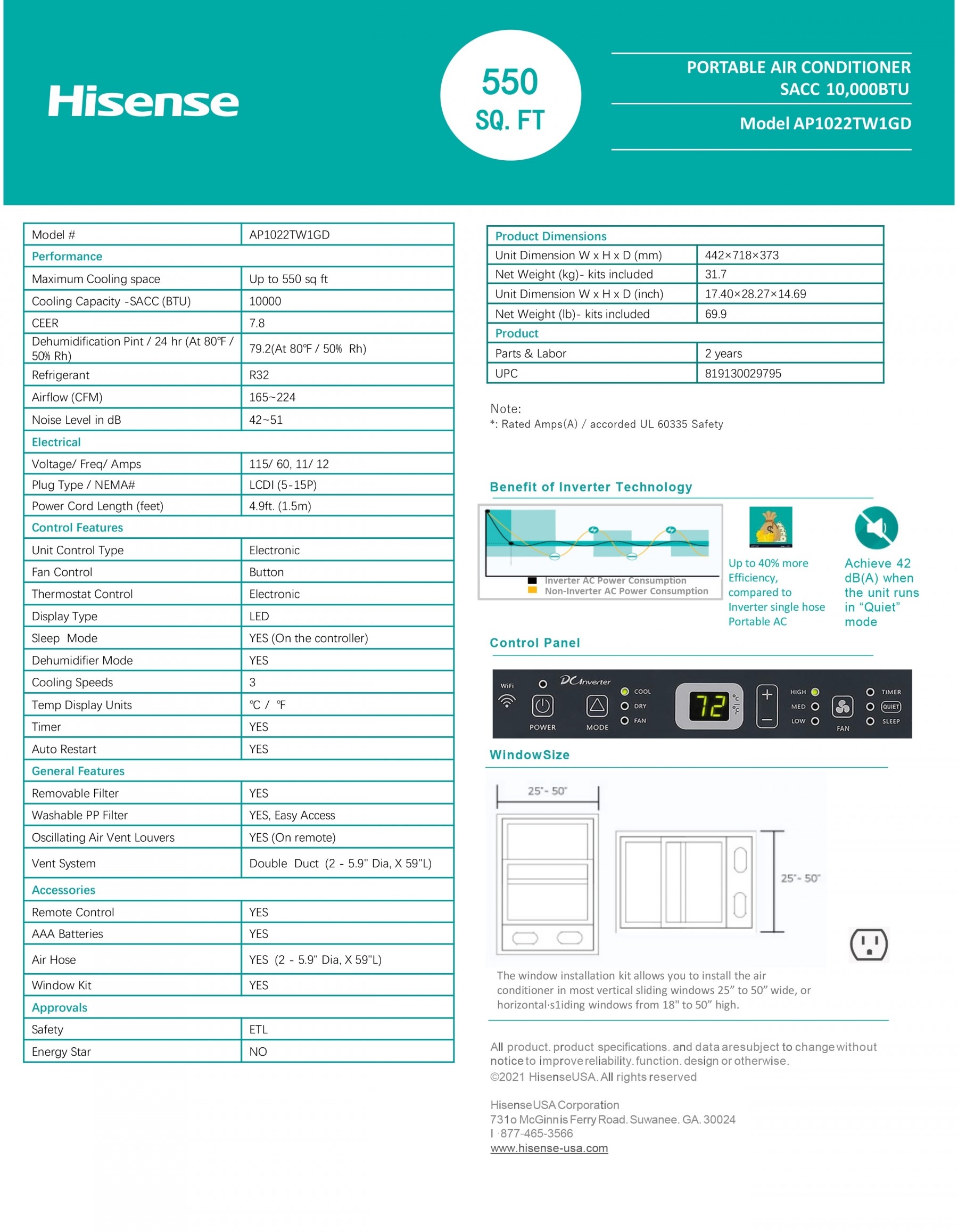 The Hisense AP1022TW1GD portable air conditioner is best suited for larger rooms (550 sq ft or less), delivering 10,000 BTU of cooling power. It provides three modes of comfort –cooling, fan, or dehumidifier –allowing you to choose the comfort you want at any time. The convenient drain-free design means you never need to worry about removing condensed moisture, and the inverter technology is super-efficient and ultra-quiet. The ConnectLife smart app and included remote control put easy operation right at your fingertips.
