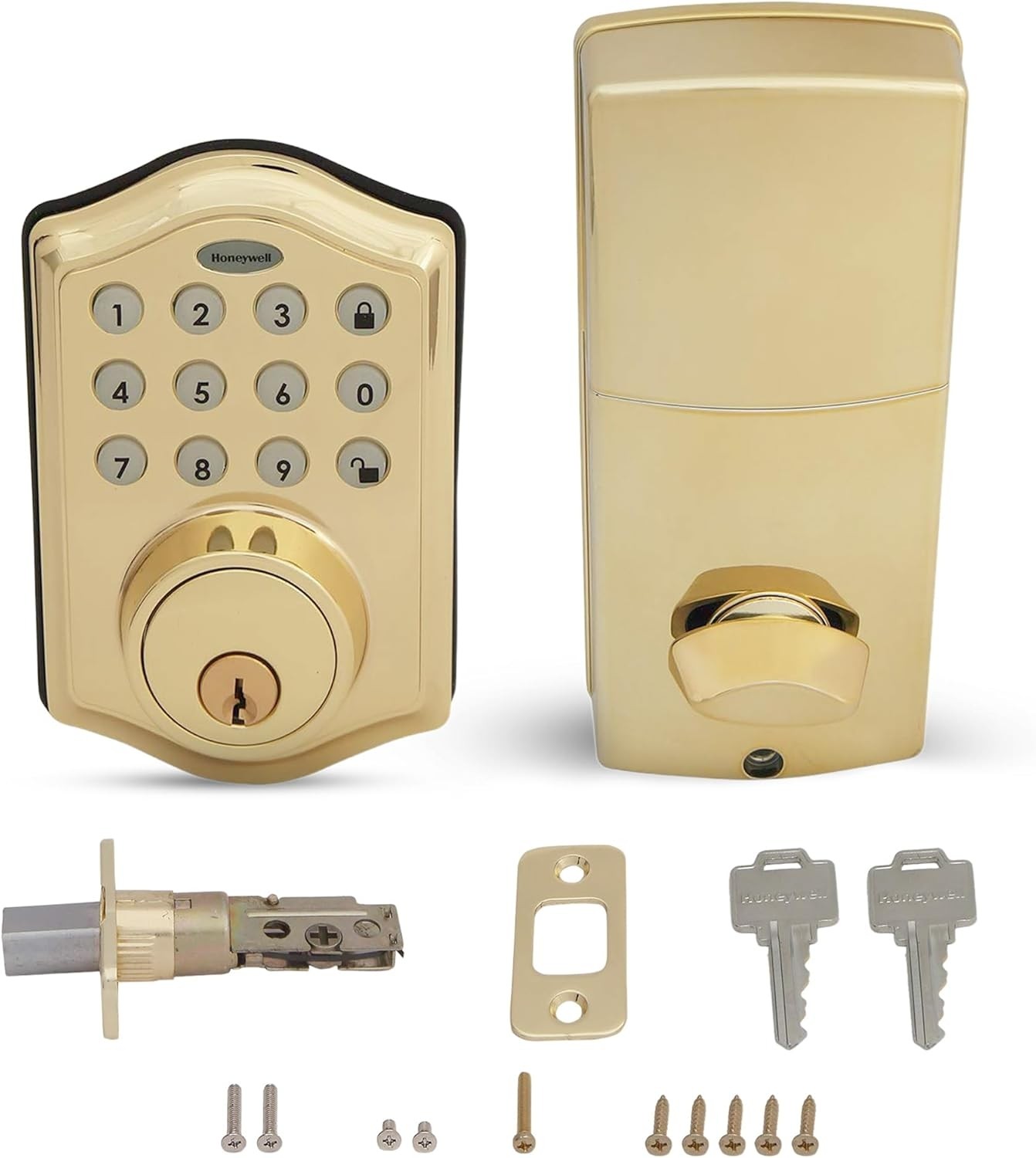Brand Honeywell Special Feature Auto-Lock Lock Type Keypad Item dimensions L x W x H 2.9 x 2 x 6.2 inches Material Brass Recommended Uses For Product Security Style Electronic Entry Deadbolt Color Polished Brass Number of Pieces 4 Finish Type Polished Included Components Digital deadbolt, installation Hardware Kit and 2 Keys included Controller Type Hand Control, SmartThings Shape Rectangular Item Weight 2.4 Pounds Control Method Touch Manufacturer Honeywell Part Number 8712009 Item Weight 2.4 pounds Product Dimensions 2.9 x 2 x 6.2 inches Item model number 8712009 - Reviews