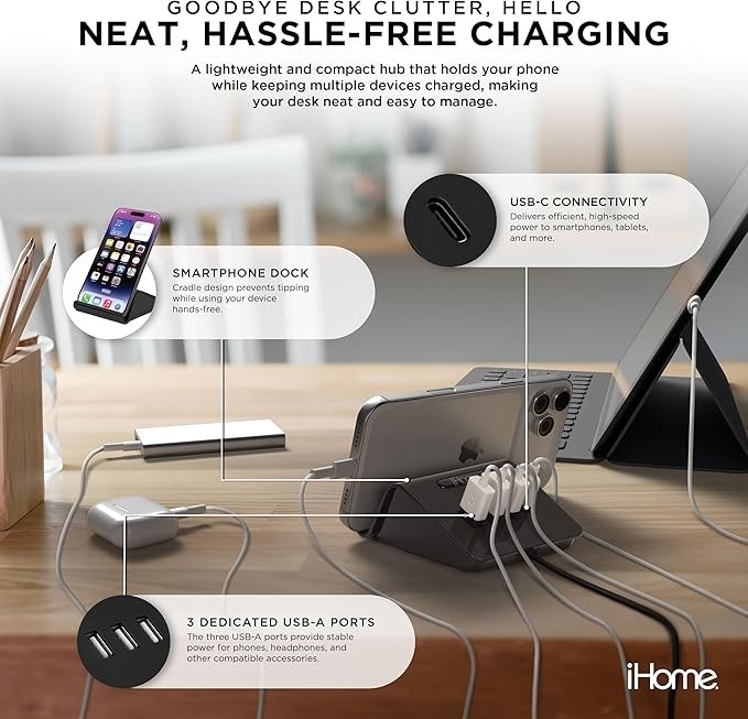 iHome 4 Port USB Charging Hub with Phone Holder- Black 2IHCH2267B4L2 Description: