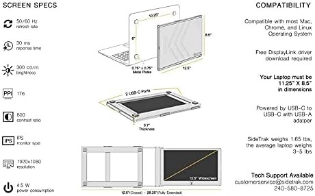 The SideTrak ST12BL is a 12.5‑inch Full HD (1920 × 1080) attachable portable monitor designed to turn your laptop into a dual‑screen workstation anywhere you go, featuring an IPS panel for sharp visuals, wide viewing angles, and consistent color performance. It magnetically mounts to the back of compatible 13"–17.5" laptops using sliding tracks, allowing the screen to pull out when needed and slide back behind the laptop when not in use, with rotation up to 180°–270° for easy screen sharing. Powered entirely over USB, the ST12BL connects via USB‑C with an included USB‑A adapter, requires no external power supply, and supports mirrored or extended display modes on Windows, macOS, ChromeOS, and Linux systems. Lightweight at approximately 1.65 lb and TSA‑approved, it is ideal for professionals who need extra screen space for productivity while traveling, working remotely, or hot‑desking.SideTrak Slide Portable Monitor for Laptop 12.5" FHD 1080P IPS Attachable Laptop Screen, Efficient USB Power, Compatible with Mac & Chrome 13" -17" Laptops, ST12BL