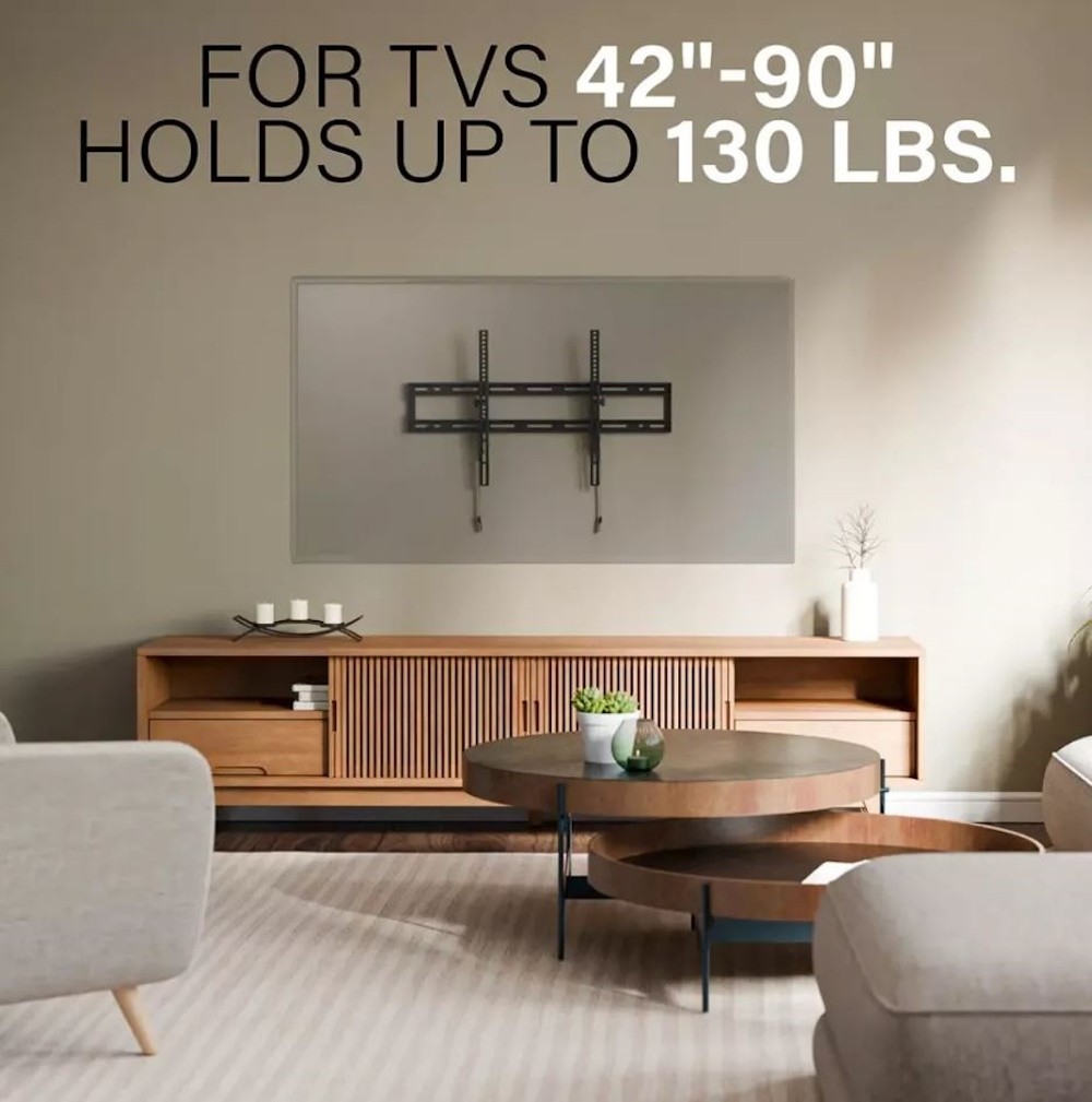 Maximum Weight (lbs.) 130 Minimum TV Size 42" Maximum TV Size 90" Item Length (in.) 28.12 Item Width (in.) 16.59 Item Height (in.) 2.12 Item Weight (lbs.) 4.5 Product Type Tilting TV Mounts Color Black TV Size Compatibility 55"-90"+ Mount Type Tilting Mount Location Wall Indoor/Outdoor Indoor Assembly Required Yes Tools Included No Hardware Included Yes Adjustable Height No Includes TV Mount, Installation Manual, Wall Template, Mount Installation Hardware Item Dimensions 28.12 x 2.12 x 16.59 Inches Item Weight 4.5 lbs. - Reviews