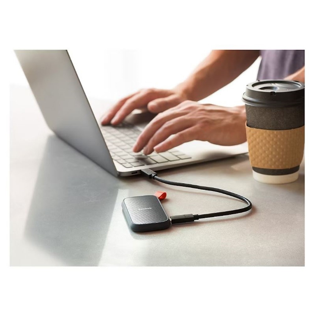 Save and access your important files and media with the SanDisk 1TB Portable SSD. This portable SSD fits seamlessly into your mobile lifestyle, thanks to its 1TB storage capacity and a 10 Gb/s USB-C 3.2 Gen 2 interface. With read speeds of up to 800 MB/s, you'll be able to access your files quickly. It is also bus powered, drop resistant up to 6.6', and can be secured to your belt loop or backpack using its integrated rubber hook. A USB-C to USB-A cable is included and protection is provided by a limited 3-year warranty.