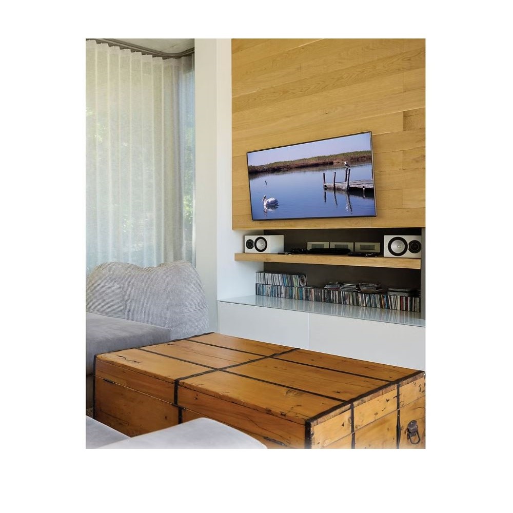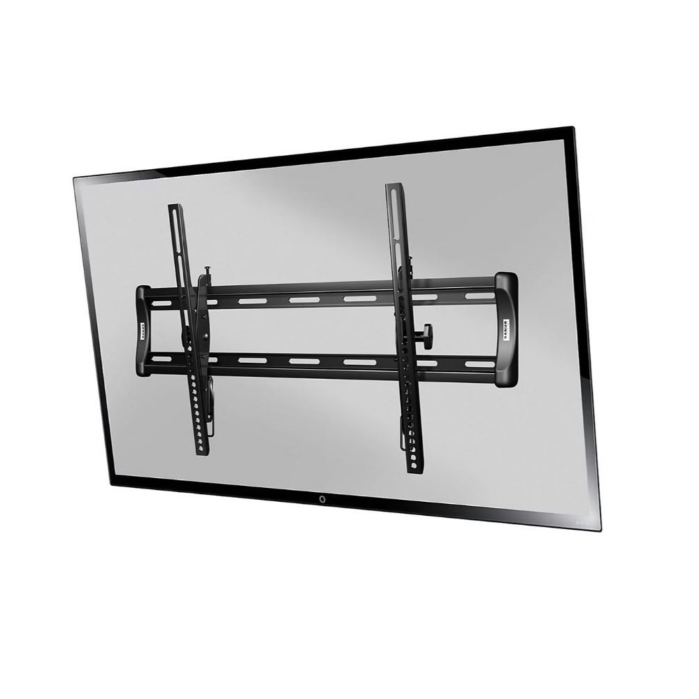 The SANUS Decora Tilting Wall Mount is an unparalleled wall mount solution for most 40" – 90" flat-panel TVs up to 130 lbs. This mount features an exclusive tilting technology for effortless adjustment of viewing angles, helping to reduce glare with up to 15º of tilt without the use of tools. Its low-profile design places the TV just 2" from the wall for a clean, flush appearance. Laterally adjustable TV brackets allow the mount to shift left and right on the wall plate for perfect placement, even with off-center wall studs. A quick latching mechanism holds the TV securely on the wall, and solid construction provides strength and durability.