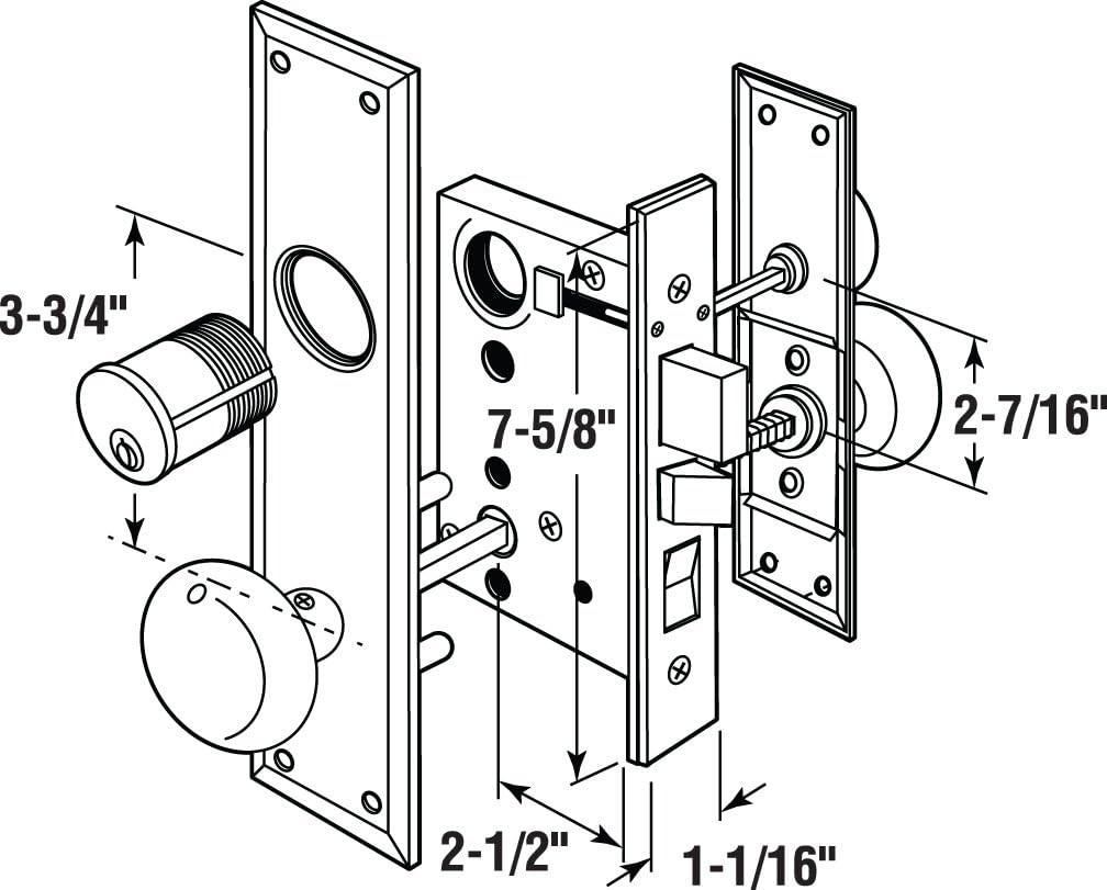 - DIMENSIONS – This mortise lock has a 2-1/2 inch backset, 1-1/16 inch x 7-5/8 inch faceplate, 9/16 inch latch projection, 1 inch deadbolt projection, and has 2-1/4 inch in diameter knobs